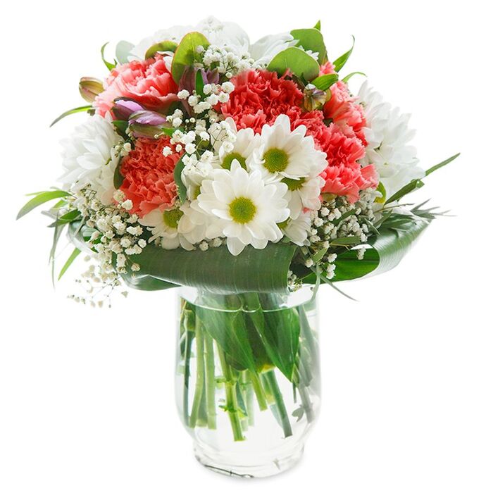 Discover the allure of sophistication with our Refined Bloom Ensemble, a bouquet that speaks the language of luxury and heartfelt emotion. This arrangement features a charming mix of white chrysanthemums, tender gypsophila, and light pink carnations, elegantly arranged with lush aspidistra leaves. Each flower is hand-selected to ensure the highest quality and lasting freshness, crafting a gift that is both beautiful and meaningful.